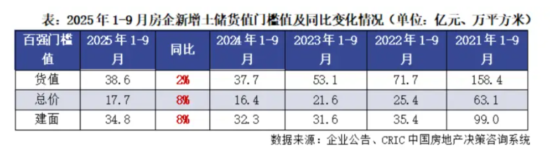 截至9月末,新增土储货值百强门槛值为38.6亿元,同比增长2%,同比由负转正;新增总价百强门槛值为17.7亿元,同比提升8%,新增建面百强门槛值为34.8万平方米,同比回升8%。