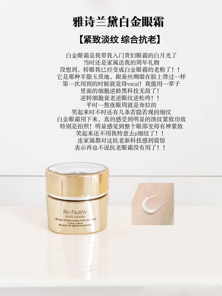 要说眼周纹路多怎么办,这个是我目前用下来淡纹效果最明显的,我原来眼下有几条非常明显的静态纹,化妆的时候,明显感觉那里总积线,自从用了白金眼霜之后,就能把眼周的小细纹慢慢填满抚平。