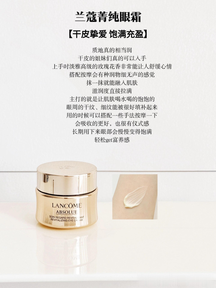很适合眼周干燥的大干皮姐妹,质地偏油润那挂,会让眼周肌肤感受到久旱逢甘霖的feel,加上玻色因的加持,能把干纹细纹都润开不少,同时支撑起眼部轮廓,用它上妆眼下不会卡粉卡纹。