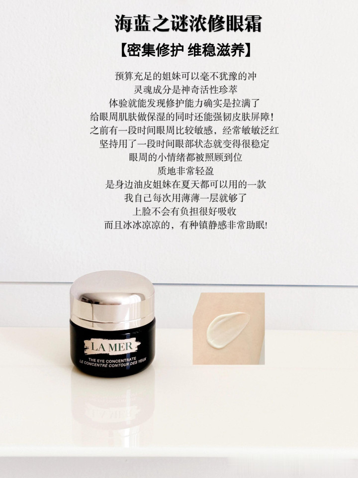 在眼霜的世界里,各司其职同样重要,尤其是在换季或者肌肤泛敏时期,它就是那个及时雨,为干燥薄弱的眼周肌肤带来滋养,直接厚厚敷上一层,顿时解渴的舒服状态。