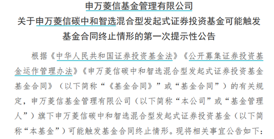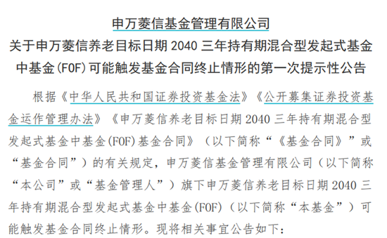 7月19日,申万菱信碳中和智选混合型发起式证券投资基金(以下简称“申万菱信碳中和智选“)和申万菱信养老目标日期2040三年持有期混合型发起式基金中基金(FOF)(以下简称“申万菱信养老目标日期2040三年持有”)发布公告称,由于基金规模过低,基金可能会触发清算程序。截至2025年6月30日,两只基金规模分别仅为0.08亿元和0.25亿元。